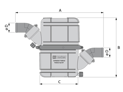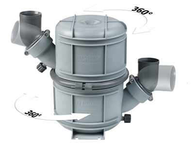 Waterlock/muffler with dual stage construction featuring upper and lower chambers with a horizontal partition plate and a riser tube through the centre. Superior silencing of exhaust noise with minimal back pressure. 360° rotatable top chamber and connectors allows easy installation. Meets the required ABYC standards.