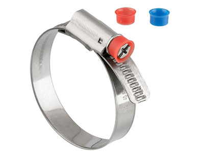 The Safety Collar is fitted around the screw head of the clamp. It prevents the screwdriver from slipping out of the slot while tightening. It also helps to identify the material quality of the clamp (Red: W1 and W2 - Blue: W3, W4 and W5)