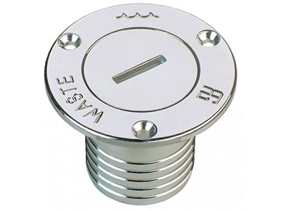 “WASTE” labelled deck filler with hose connector, in chromium-plated brass.